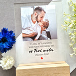 Printed organic glass in an oak stand.