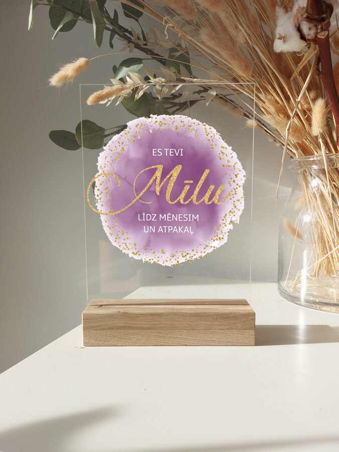 Trükitud orgaaniline klaas tammepuidust alusel.