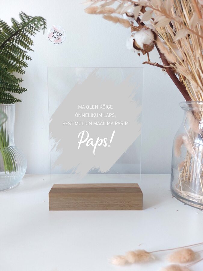 Trükitud pleksiklaas tammepuidust akals. Klaasi mõõtmed 15x21 cm