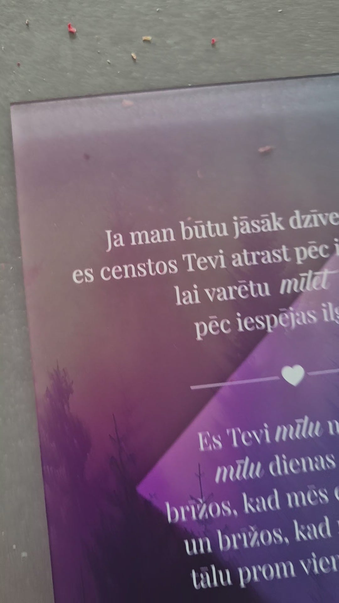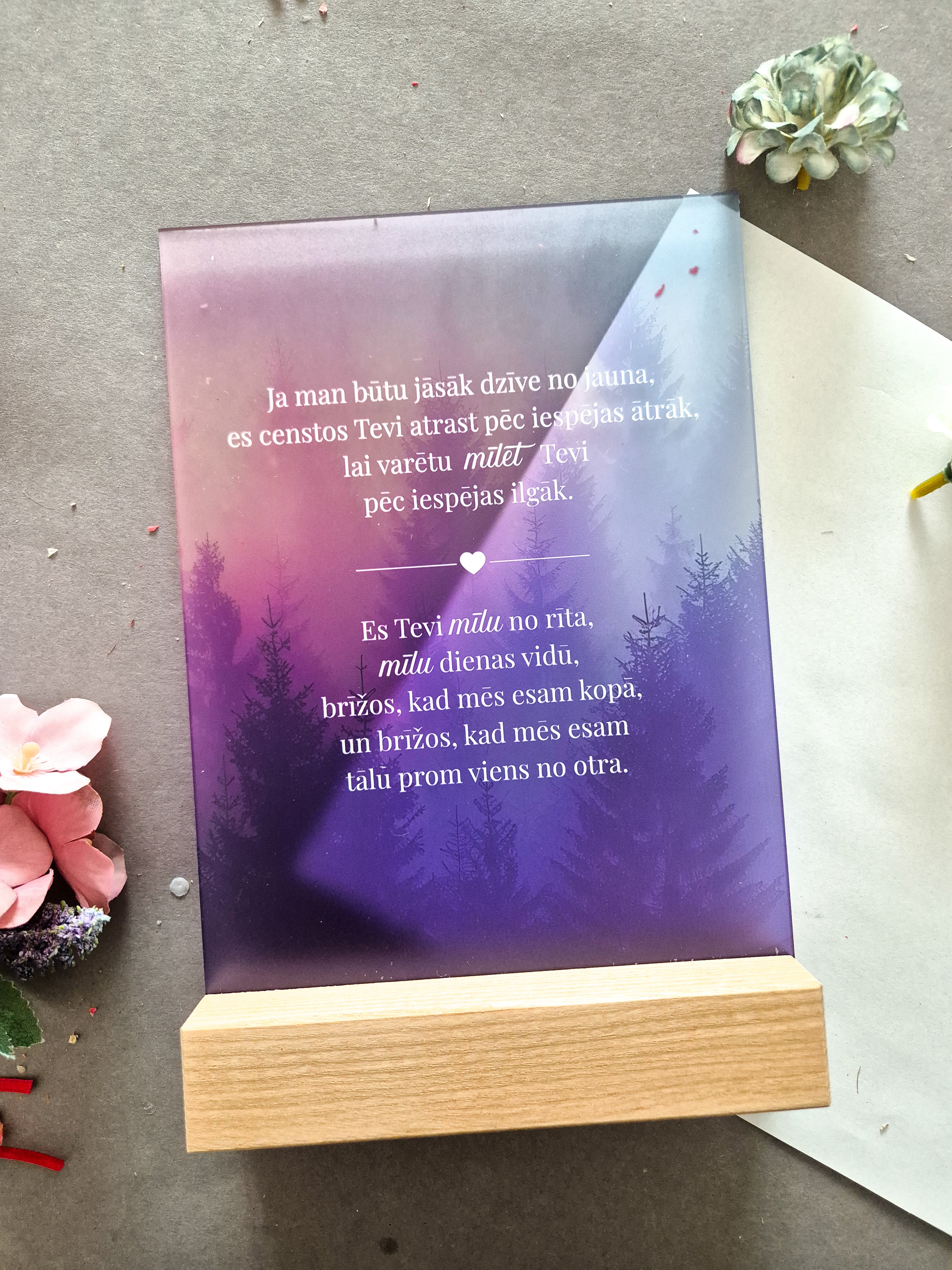 Trükitud orgaaniline klaas tammepuidust alusel.