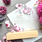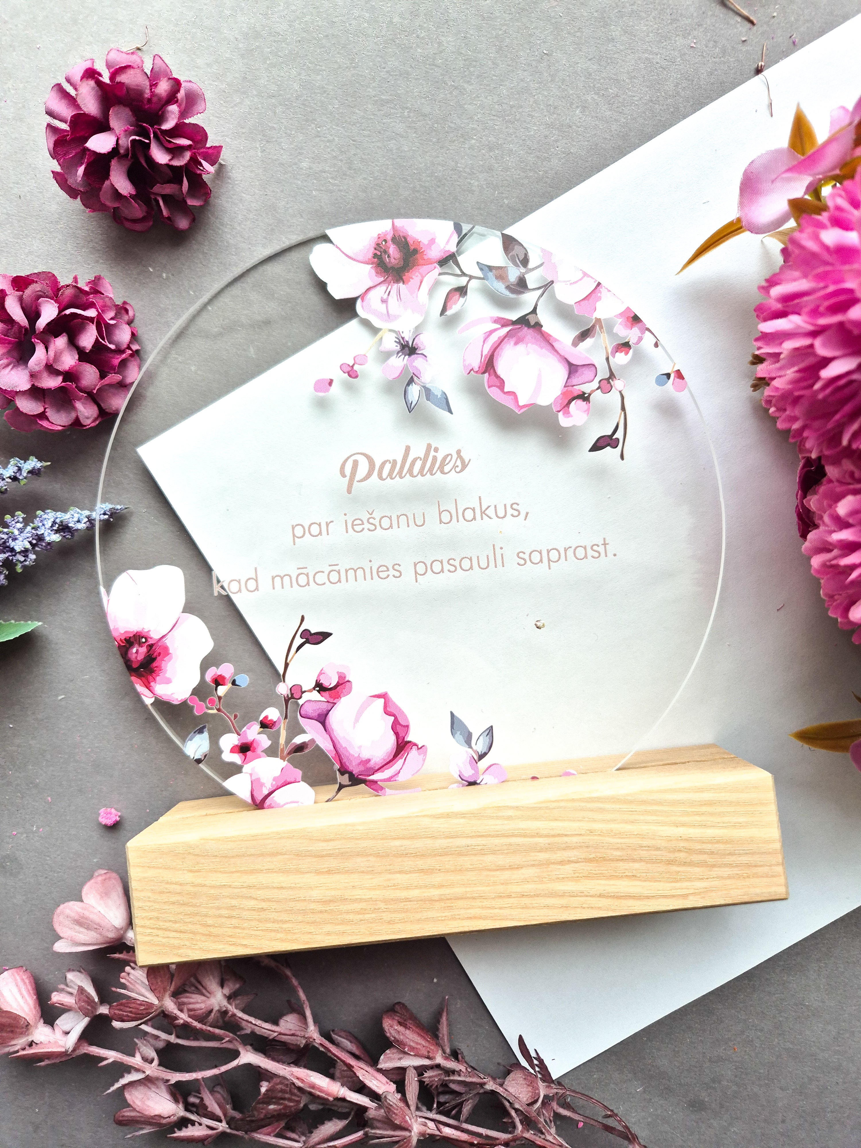 Trükitud orgaaniline klaas tammepuidust alusel.