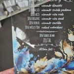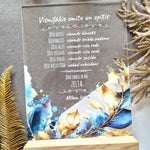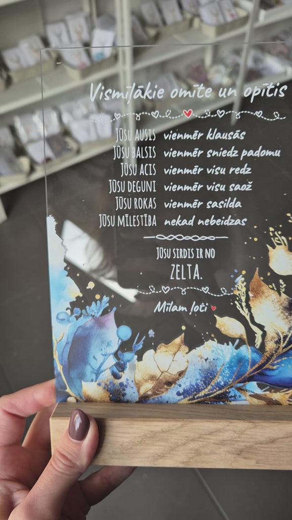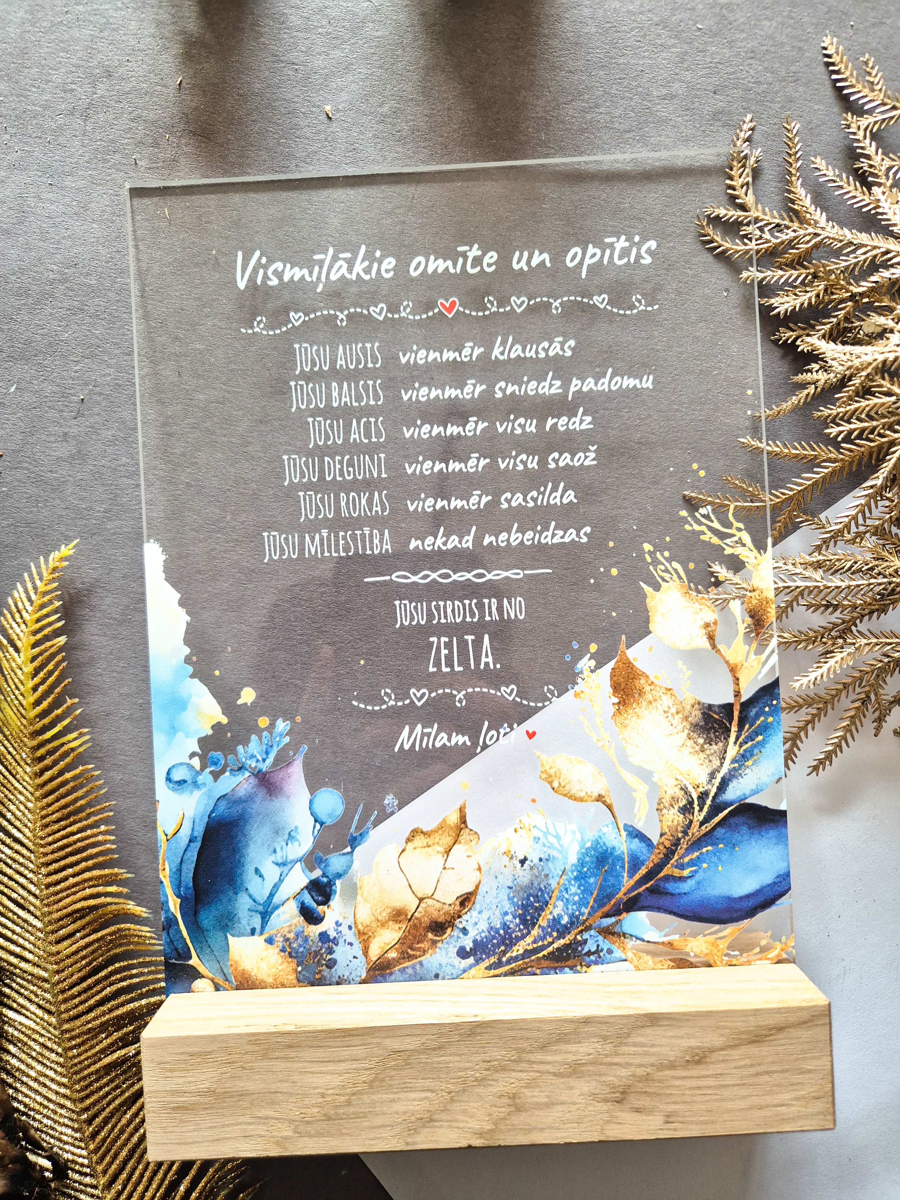 Trükitud orgaaniline klaas tammepuidust alusel.